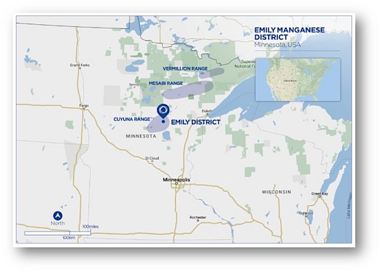 Figure 1. The Emily Project is part of the Emily District of the Cuyuna Iron Range in Crow Wing County, Central Minnesota. The Emily District includes the highest-grade manganese resource in North America.
