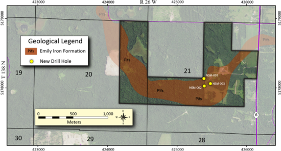 Figure 2. Location map showing land under NSC control, Emily Iron Formation bedrock which is the host strata to manganese mineralization and locations of the three completed NSC drill holes.