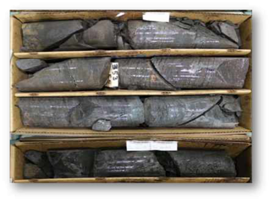 Figure 3. High-grade manganese oxide mineralization identified as mostly manganite, in drill hole NSC-23001 (between 350-358 feet).
